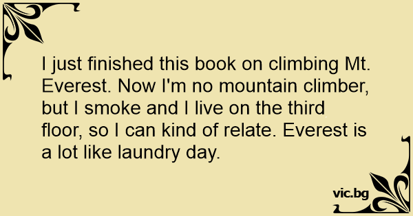 I just finished this book on climbing Mt. Everest. Now I'm no mountain climber, but I smoke and I live on the third floor, so I can kind of relate. Everest is a lot like laundry day.