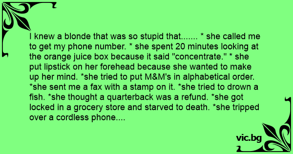 I knew a blonde that was so sтuрid that....... * she called me to get my phone number. * she spent 20 minutes looking at the orange juice box because it said "concentrate." * she put lipstick on her forehead because she wanted to make up her mind. *she tried to put M&M's in alphabetical order. *she sent me a fax with a stamp on it. *she tried to drown a fish. *she thought a quarterback was a refund. *she got locked in a grocery store and starved to death. *she tripped over a cordless phone. *she took a ruler to bed to see how long she slept. *she asked for a price check at the Dollar Store. *she studied for a blood test. *she thought Meow Mix was a CD for cats. *when she heard that 90% of all crimes occur around the home, she moved. *when she missed the 44 bus, she took the 22 bus twice instead. *when she took you to the airport and saw a sign that said "Airport Left" she turned around and went home