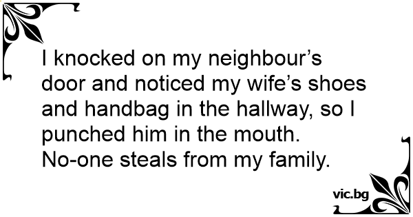 I knocked on my neighbour’s door and noticed my wife’s shoes and handbag in the hallway, so I punched him in the mouth.