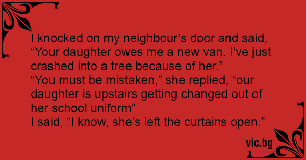 I knocked on my neighbour’s door and said, “Your daughter owes me a new van. I’ve just crashed into a tree because of her.”