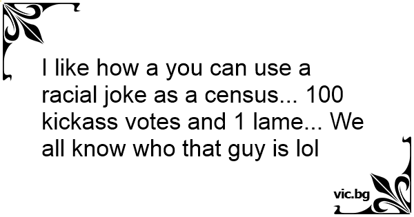 I like how a you can use a racial joke as a census... 100 kickass votes and 1 lame... We all know who that guy is lol