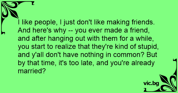 I like people, I just don't like making friends. And here's why -- you ever made a friend, and after hanging out with them for a while, you start to realize that they're kind of sтuрid, and y'all don't have nothing in common? But by that time, it's too late, and you're already married?