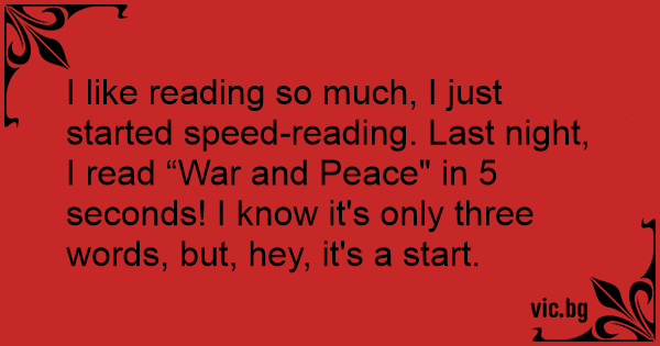 I like reading so much, I just started speed-reading. Last night, I read “War and Peace" in 5 seconds! I know it's only three words, but, hey, it's a start.