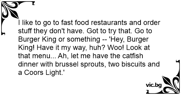 I like to go to fast food restaurants and order stuff they don't have. Got to try that. Go to Burger King or something -- 'Hey, Burger King! Have it my way, huh? Woo! Look at that menu... Ah, let me have the catfish dinner with brussel sprouts, two biscuits and a Coors Light.'