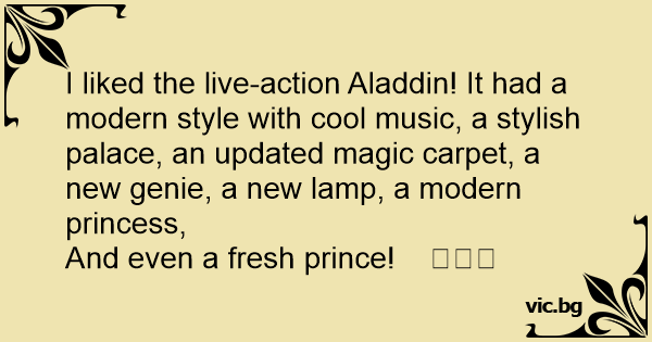 I liked the live-action Aladdin! It had a modern style with cool music, a stylish palace, an updated magic carpet, a new genie, a new lamp, a modern princess,