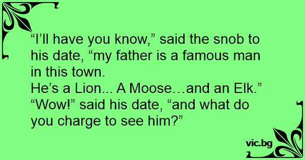 “I’ll have you know,” said the snob to his date, “my father is a famous man in this town.