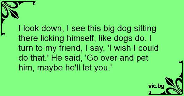 I look down, I see this big dog sitting there licking himself, like dogs do. I turn to my friend, I say, 'I wish I could do that.' He said, 'Go over and pet him, maybe he'll let you.'