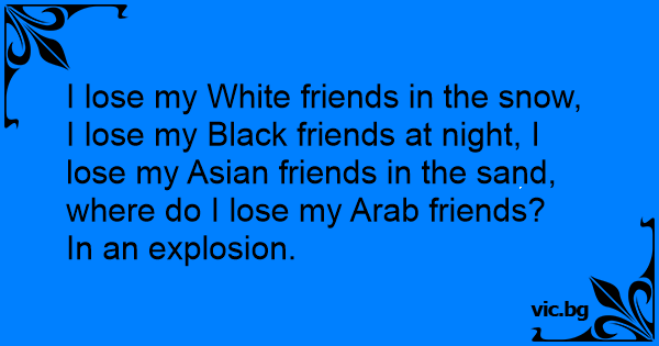 I lose my White friends in the snow, I lose my Black friends at night, I lose my Asian friends in the sand, where do I lose my Arab friends?
