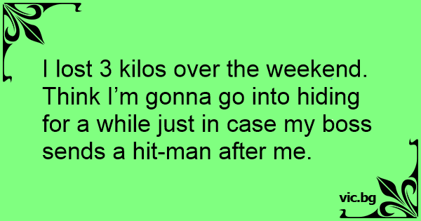 I lost 3 kilos over the weekend. Think I’m gonna go into hiding for a while just in case my boss sends a hit-man after me.