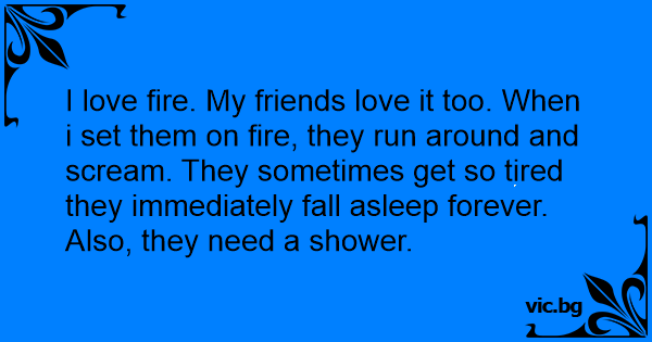 I love fire. My friends love it too. When i set them on fire, they run around and scream. They sometimes get so tired they immediately fall asleep forever. Also, they need a shower.