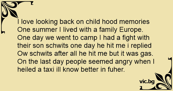 I love looking back on child hood memories One summer I lived with a family Europe. One day we went to camp I had a fight with their son schwits one day he hit me i replied Ow schwits after all he hit me but it was gas. On the last day people seemed angry when I heiled a taxi ill know better in fuher.