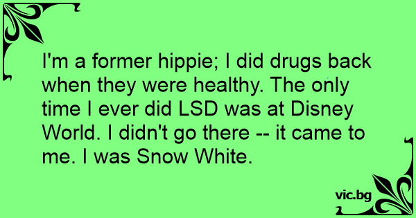 I'm a former hippie; I did drugs back when they were healthy. The only time I ever did LSD was at Disney World. I didn't go there -- it came to me. I was Snow White.