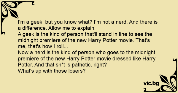 Now a nerd is the kind of person who goes to the midnight premiere of the new Harry Potter movie dressed like Harry Potter. And that sh*t is pathetic, right?