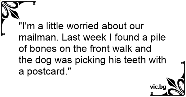 "I'm a little worried about our mailman. Last week I found a pile of bones on the front walk and the dog was picking his teeth with a postcard."