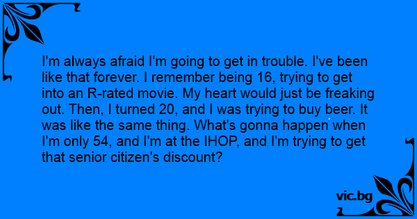 I'm always afraid I'm going to get in trouble. I've been like that forever. I remember being 16, trying to get into an R-rated movie. My heart would just be freaking out. Then, I turned 20, and I was trying to buy вееr. It was like the same thing. What's gonna happen when I'm only 54, and I'm at the IHOP, and I'm trying to get that senior citizen's discount?