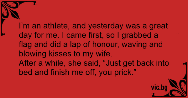 I’m an athlete, and yesterday was a great day for me. I came first, so I grabbed a flag and did a lap of honour, waving and blowing kisses to my wife.