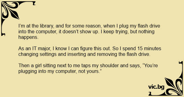 Then a girl sitting next to me taps my shoulder and says, “You’re plugging into my computer, not yours.”
