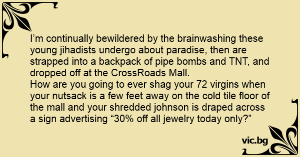 How are you going to ever shаg your 72 virgins when your nuтsаск is a few feet away on the cold tile floor of the mall and your shredded johnson is draped across a sign advertising “30% off all jewelry today only?”