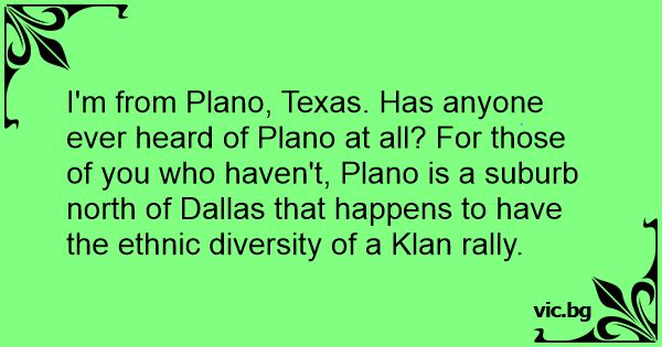 I'm from Plano, Texas. Has anyone ever heard of Plano at all? For those of you who haven't, Plano is a suburb north of Dallas that happens to have the ethnic diversity of a Кlаn rally.