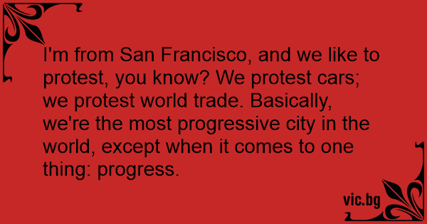 I'm from San Francisco, and we like to protest, you know? We protest cars; we protest world trade. Basically, we're the most progressive city in the world, except when it comes to one thing: progress.