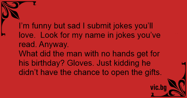 What did the man with no hands get for his birthday? Gloves. Just kidding he didn’t have the chance to open the gifts.