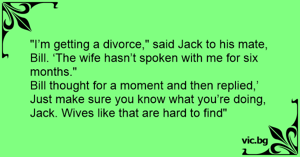 "I’m getting a divorce," said Jack to his mate, Bill. ‘The wife hasn’t spoken with me for six months."