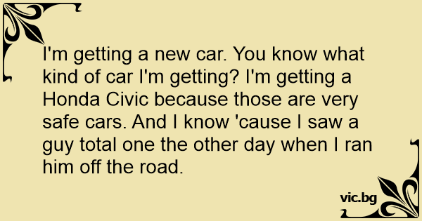 I'm getting a new car. You know what kind of car I'm getting? I'm getting a Honda Civic because those are very safe cars. And I know 'cause I saw a guy total one the other day when I ran him off the road.