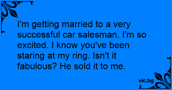 I'm getting married to a very successful car salesman. I'm so excited. I know you've been staring at my ring. Isn't it fabulous? He sold it to me.