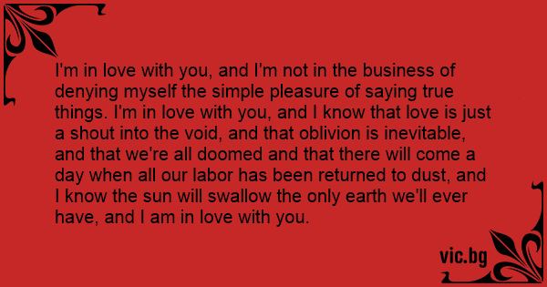 I'm in love with you, and I'm not in the business of denying myself the simple pleasure of saying true things. I'm in love with you, and I know that love is just a shout into the void, and that oblivion is inevitable, and that we're all doomed and that there will come a day when all our labor has been returned to dust, and I know the sun will swallow the only earth we'll ever have, and I am in love with you.