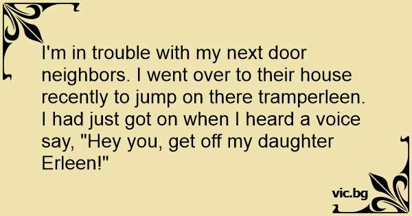 I'm in trouble with my next door neighbors. I went over to their house recently to jump on there tramperleen. I had just got on when I heard a voice say, "Hey you, get off my daughter Erleen!"