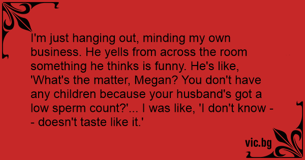 I'm just hanging out, minding my own business. He yells from across the room something he thinks is funny. He's like, 'What's the matter, Megan? You don't have any children because your husband's got a low sреrм count?'... I was like, 'I don't know -- doesn't taste like it.'