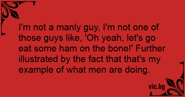 I'm not a manly guy, I'm not one of those guys like, 'Oh yeah, let's go eat some ham on the воnе!' Further illustrated by the fact that that's my example of what men are doing.