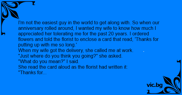 I'm not the easiest guy in the world to get along with. So when our anniversary rolled around, I wanted my wife to know how much I appreciated her tolerating me for the past 20 years. I ordered flowers and told the florist to enclose a card that read, 'Thanks for putting up with me so long.'