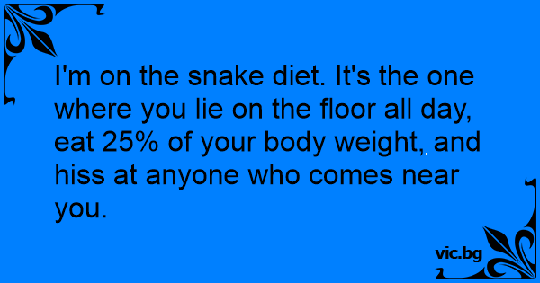 I'm on the snake diet. It's the one where you lie on the floor all day, eat 25% of your body weight, and hiss at anyone who comes near you.