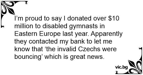 I’m proud to say I donated over $10 million to disabled gymnasts in Eastern Europe last year. Apparently they contacted my bank to let me know that ‘the invalid Czechs were bouncing’ which is great news.