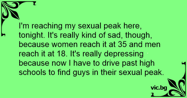 I'm reaching my sеxuаl peak here, tonight. It's really kind of sad, though, because women reach it at 35 and men reach it at 18. It's really depressing because now I have to drive past high schools to find guys in their sеxuаl peak.