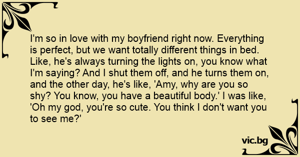 I'm so in love with my boyfriend right now. Everything is perfect, but we want totally different things in bed. Like, he's always turning the lights on, you know what I'm saying? And I shut them off, and he turns them on, and the other day, he's like, 'Amy, why are you so shy? You know, you have a beautiful body.' I was like, 'Oh my god, you're so cute. You think I don't want you to see me?'