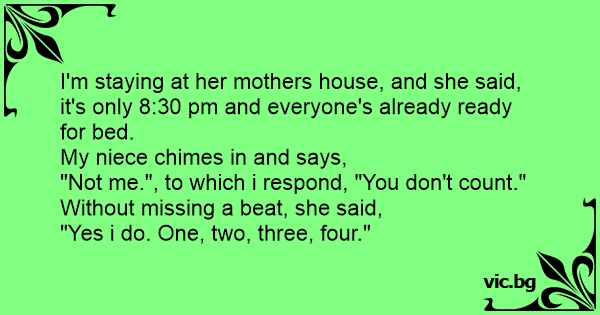 I'm staying at her mothers house, and she said, it's only 8:30 pm and everyone's already ready for bed.