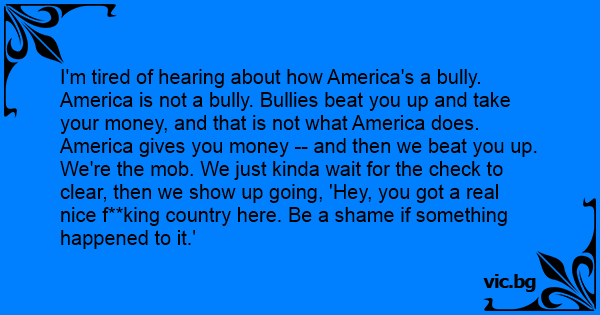I'm tired of hearing about how America's a bully. America is not a bully. Bullies beat you up and take your money, and that is not what America does. America gives you money -- and then we beat you up. We're the mob. We just kinda wait for the check to clear, then we show up going, 'Hey, you got a real nice f**king country here. Be a shame if something happened to it.'