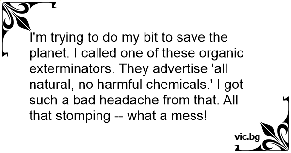 I'm trying to do my bit to save the planet. I called one of these organic exterminators. They advertise 'all natural, no harmful chemicals.' I got such a bad headache from that. All that stomping -- what a mess!