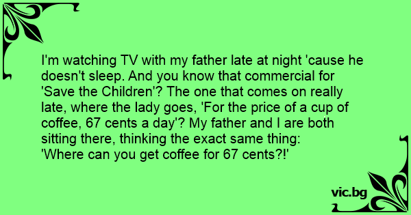 I'm watching TV with my father late at night 'cause he doesn't sleep. And you know that commercial for 'Save the Children'? The one that comes on really late, where the lady goes, 'For the price of a cup of coffee, 67 cents a day'? My father and I are both sitting there, thinking the exact same thing: