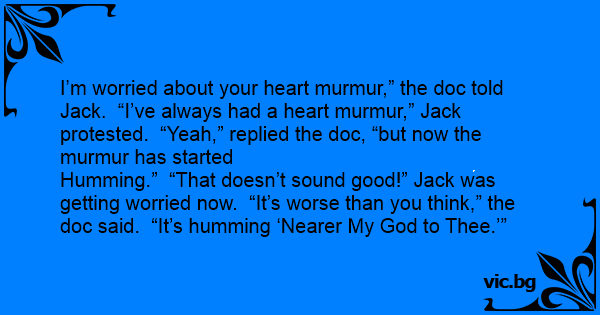 I’m worried about your heart murmur,” the doc told Jack. “I’ve always had a heart murmur,” Jack protested. “Yeah,” replied the doc, “but now the murmur has started