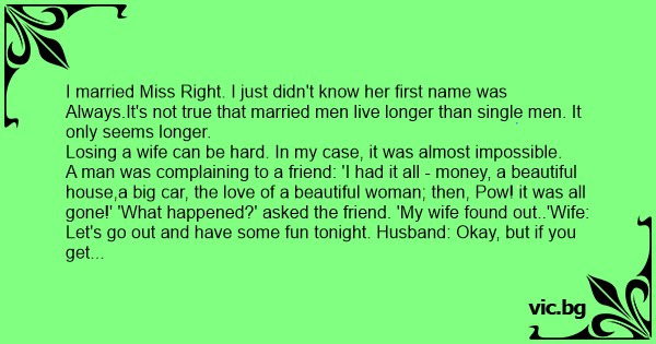 I married Miss Right. I just didn't know her first name was Always.It's not true that married men live longer than single men. It only seems longer.