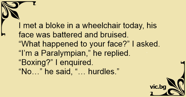 I met a bloke in a wheelchair today, his face was battered and bruised.