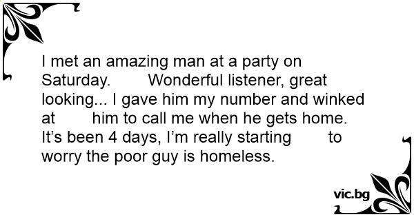 I met an amazing man at a party on Saturday. Wonderful listener, great looking... I gave him my number and winked at him to call me when he gets home. It’s been 4 days, I’m really starting to worry the poor guy is homeless.