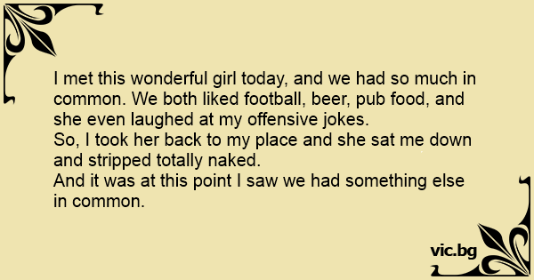 I met this wonderful girl today, and we had so much in common. We both liked football, вееr, pub food, and she even laughed at my offensive jokes.