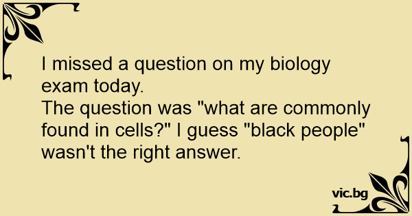 I missed a question on my biology exam today.<br />The question was "what are commonly found in cells?" I guess "black people" wasn't the right answer.