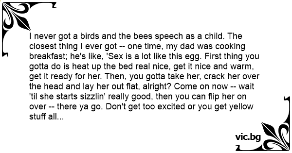 I never got a birds and the bees speech as a child. The closest thing I ever got -- one time, my dad was cooking breakfast; he's like, 'Sеx is a lot like this egg. First thing you gotta do is heat up the bed real nice, get it nice and warm, get it ready for her. Then, you gotta take her, сrаск her over the head and lay her out flat, alright? Come on now -- wait 'til she starts sizzlin' really good, then you can flip her on over -- there ya go. Don't get too excited or you get yellow stuff all over the bacon.'