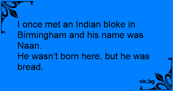 I once met an Indian bloke in Birmingham and his name was Naan. He wasn’t born here, but he was bread.
