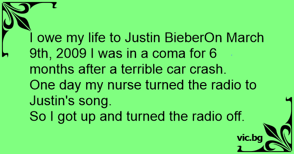 I owe my life to Justin BieberOn March 9th, 2009 I was in a coma for 6 months after a terrible car crash.